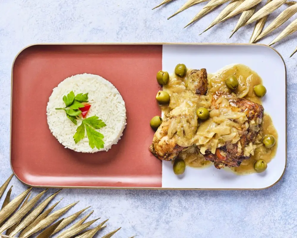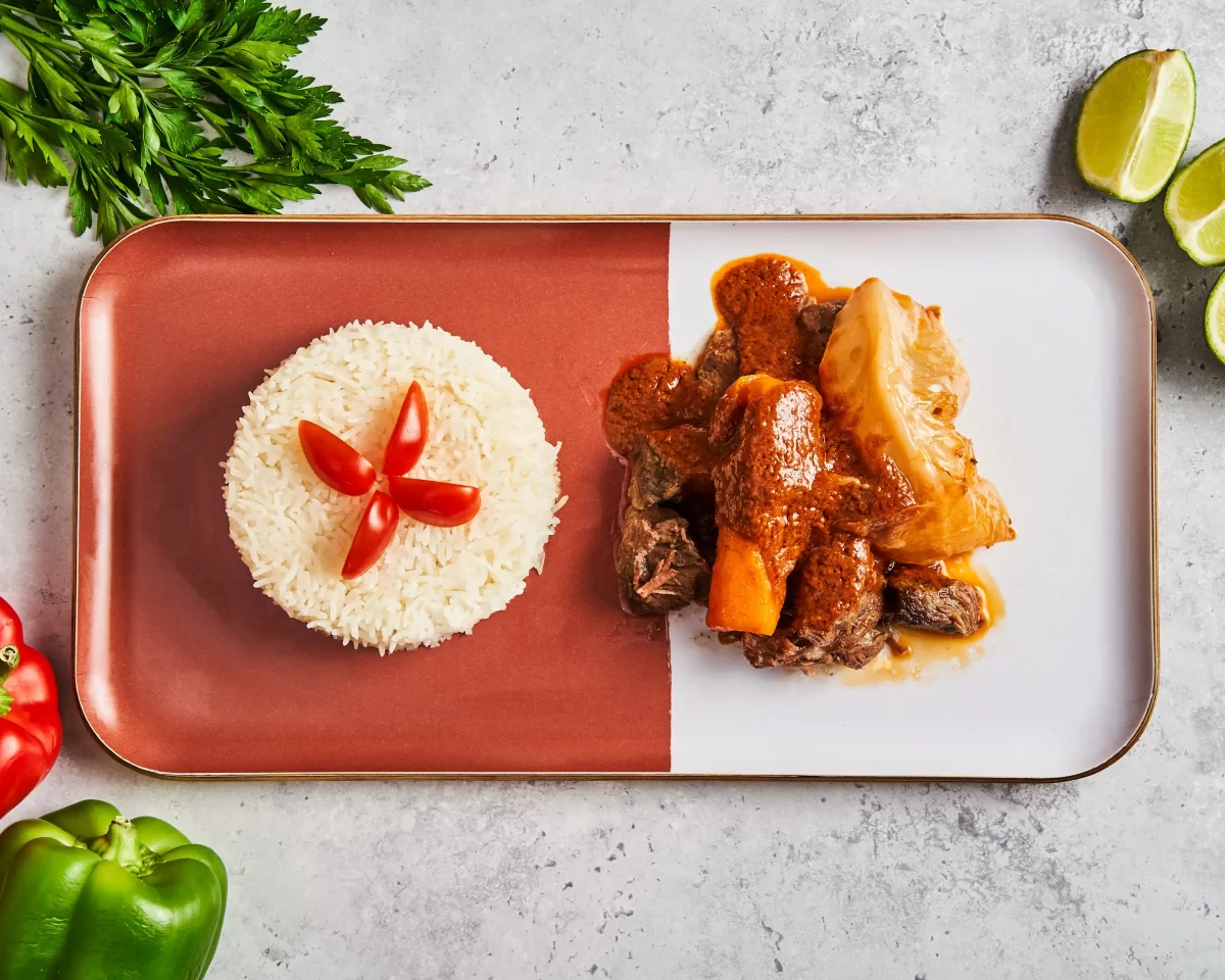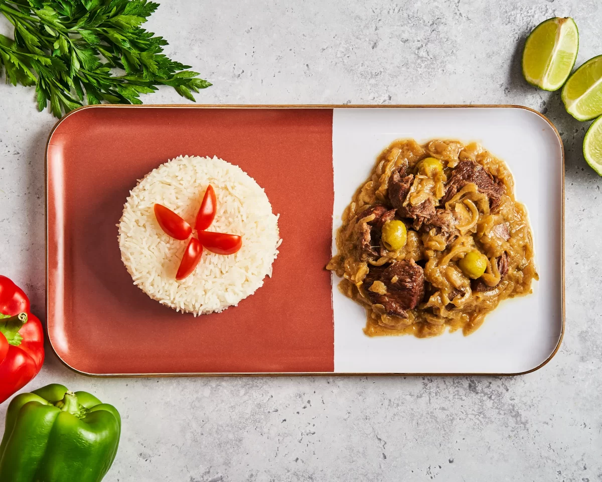 Sauce aux oignons, olives et carottes, accompagnée de riz blanc.