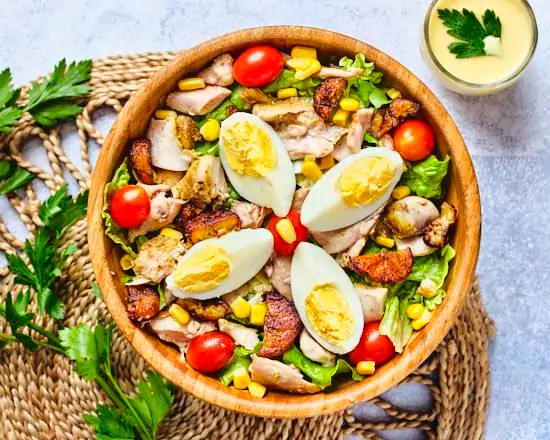 Tomates cerises, thon, maïs, œuf, avocat et crevettes, accompagnés d’une sauce vinaigrette faite maison.